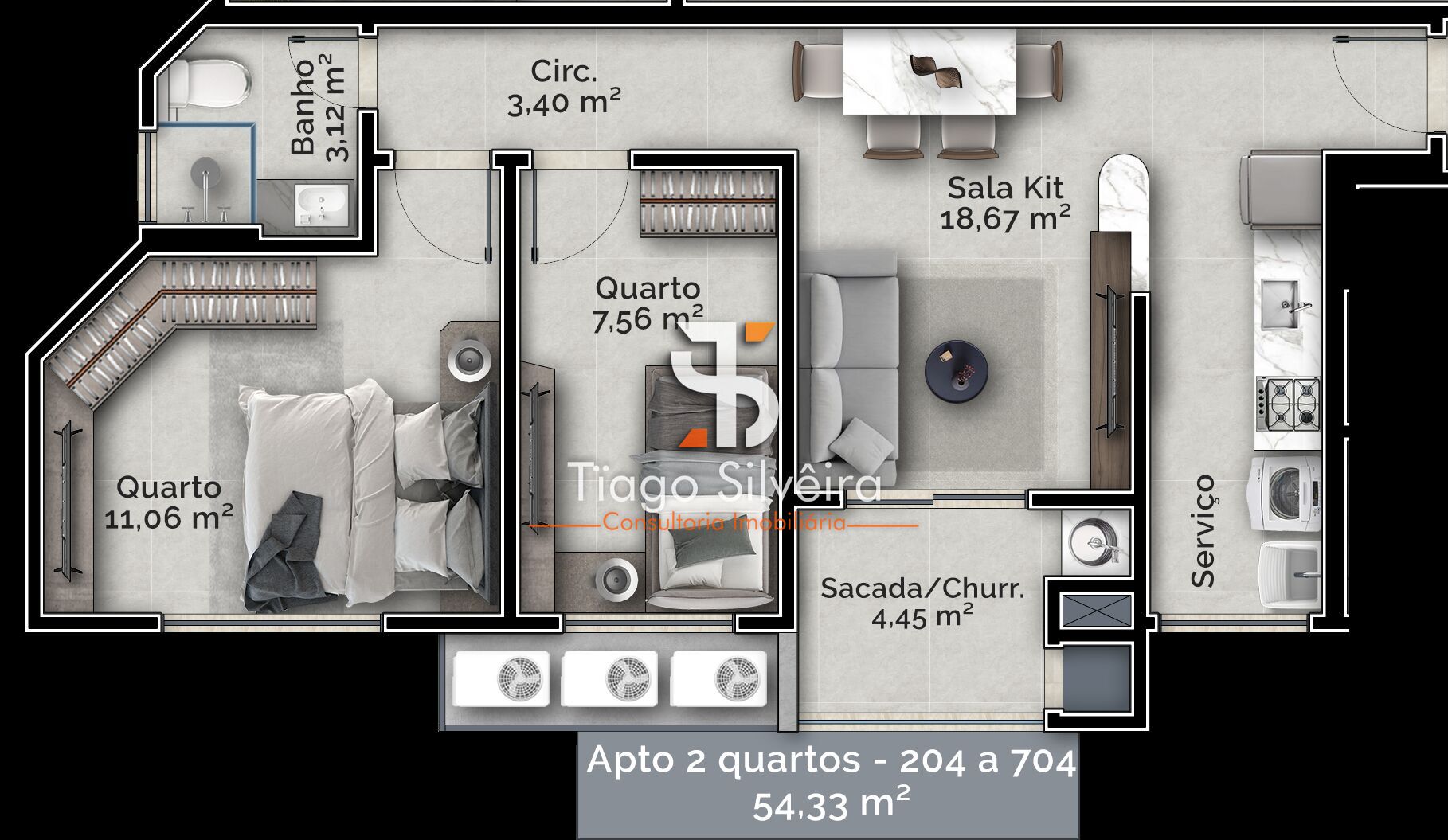 - Área privativa: 54,33m²