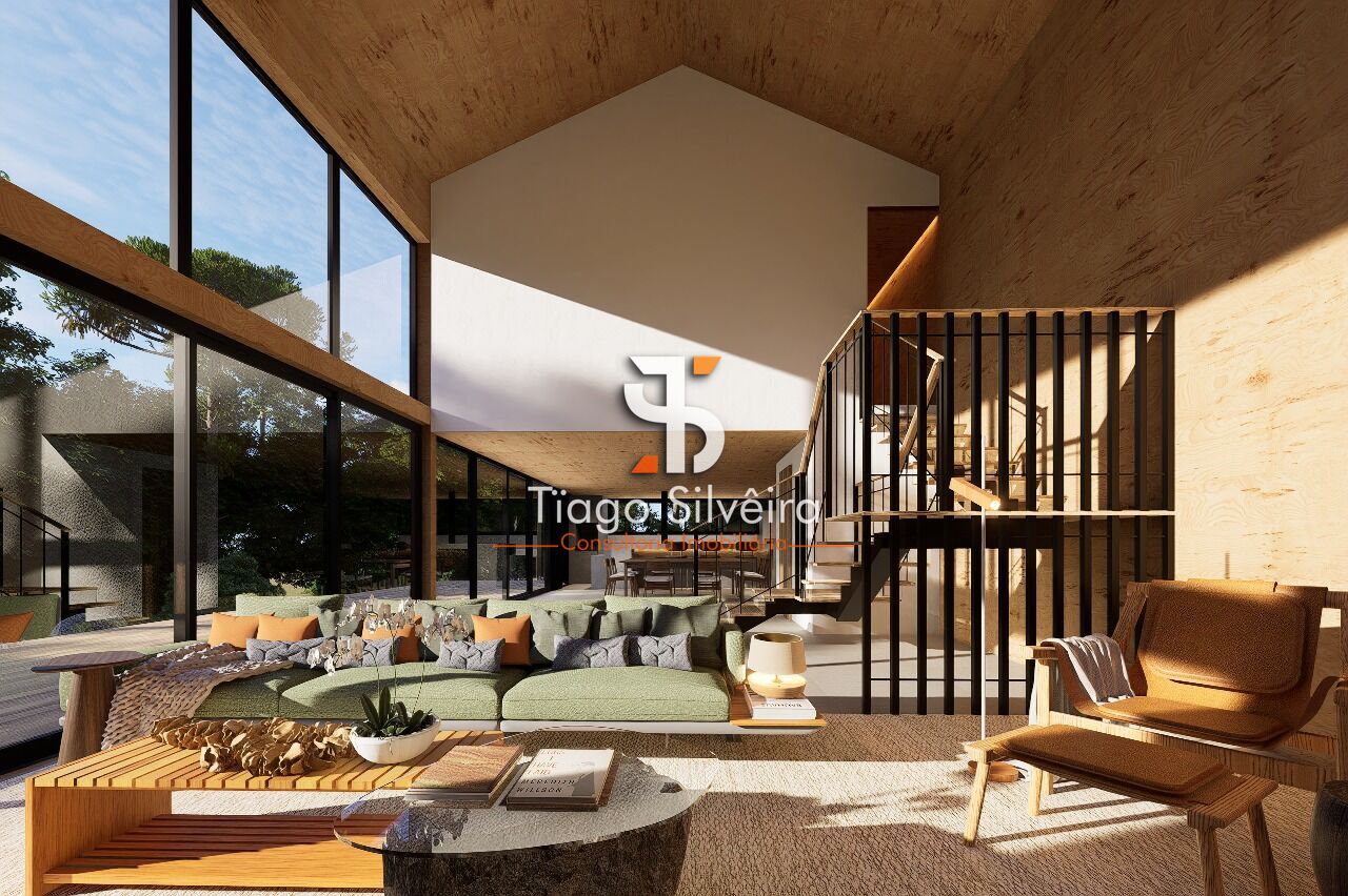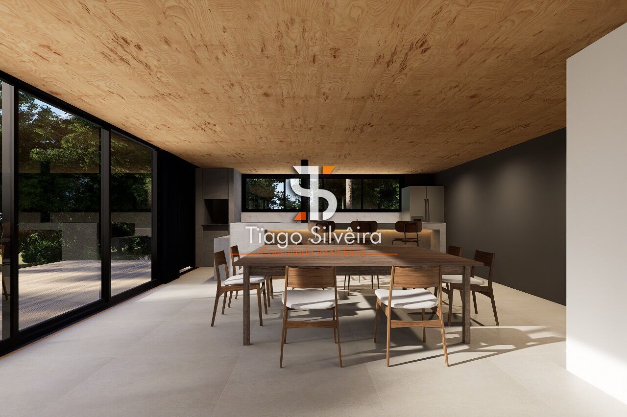 • Térreo (98 m²): com piso em cimento queimado, integração entre cozinha, sala de estar com lareira, sala de jantar e churrasqueira interna.
